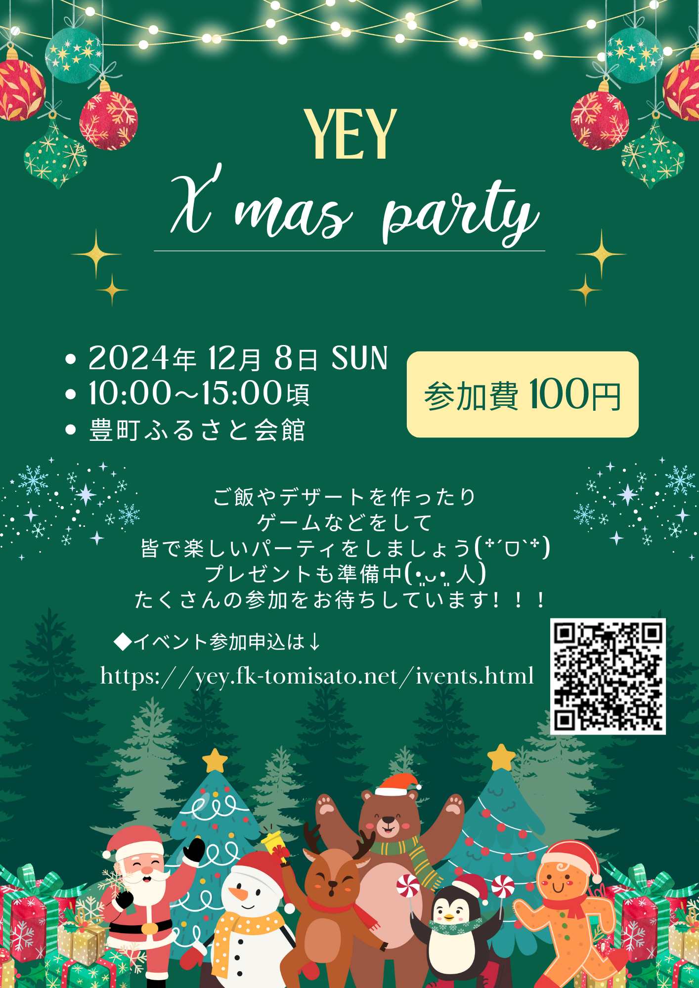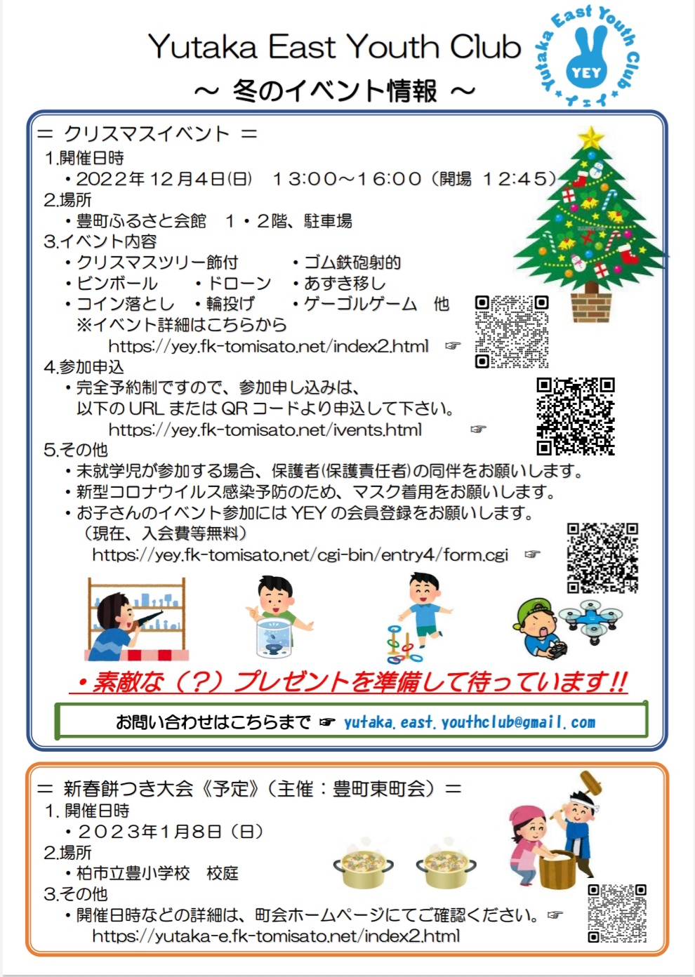 ※こちらのクリスマスイベントは未就学児のご兄弟の参加も可能ですが、お子様から目を離さず必ず保護者(保護責任者)付き添いの元YEY会員のご兄弟と一緒にご参加ください。又、体験参加という形の為、プレゼントなどYEY会員メンバーの物と異なる事をご理解ご了承の上ご参加ください。